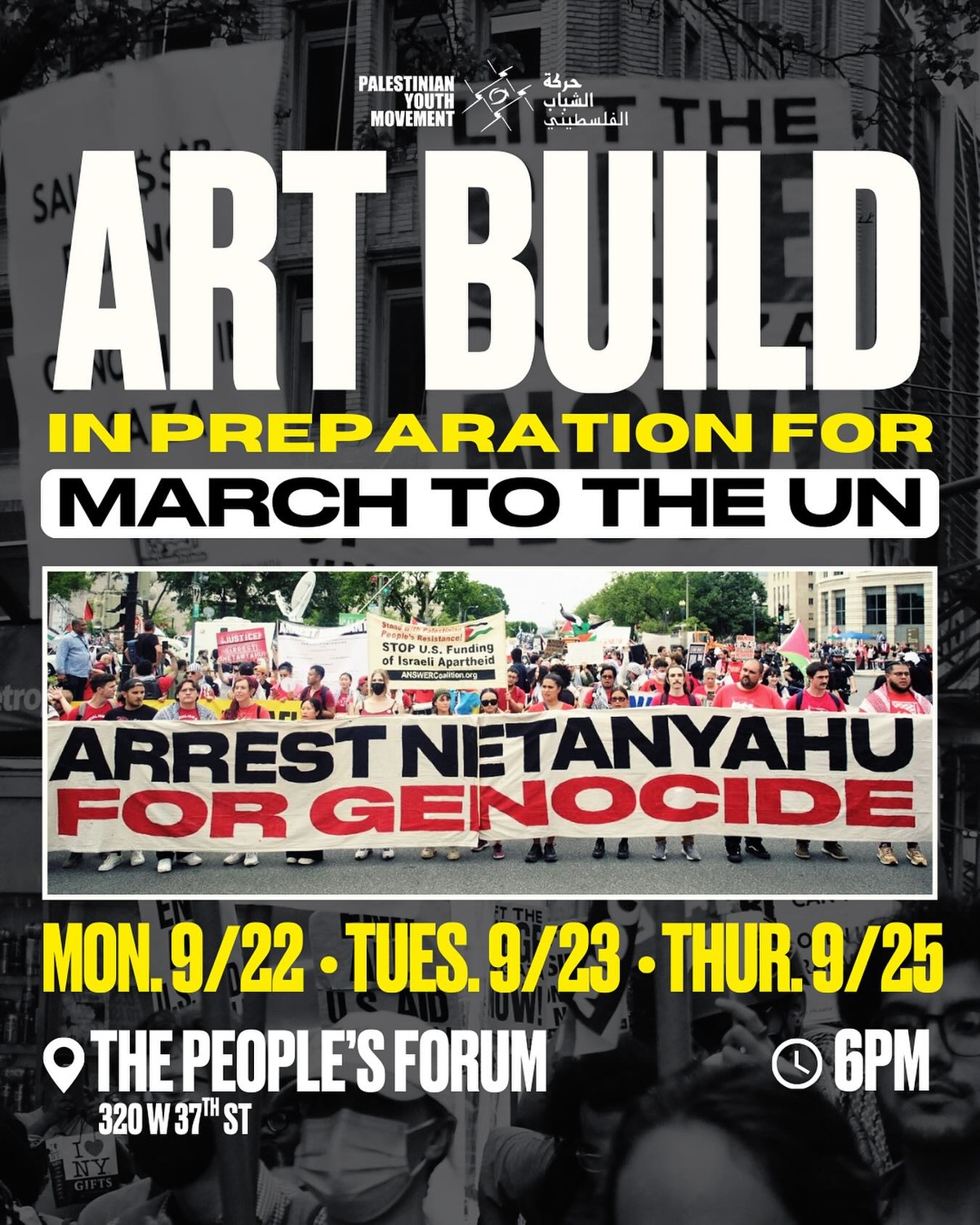 ART BUILD π¨π΅πΈ Join us next week for art builds in preparation for the march to UN on September 26th.